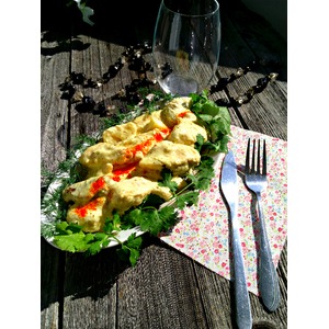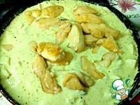 Выложить кусочки грудки в сливочный соус и протушить еще пару минут (из-за куркумы соус на фото получился зеленоватый) |