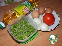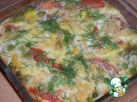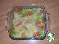 Лук обжарить на растительном масле до полуготовности, добавить помидор и горошек, немого посолить. Потушить 2-3 минуты. Овощи выложить в форму для запекания. |