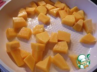 Тыкву нарезать небольшими кубиками, обжарить на растительном масле 2-3 минуты. |