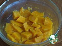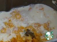 В ведерко хлебопечки (или в миску, если вы замешиваете тесто руками) выливаем сметану, кладем тыкву, которую предварительно слегка размяли вилкой. Не нужно разминать тыкву до однородности. |