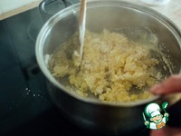 Снять с огня и одним движение всыпать муку, при этом постоянно помешивая деревянной лопаткой. Вымешать и вернуть на средний огонь. Хорошенько мешать муку до образования комка. |