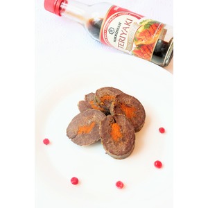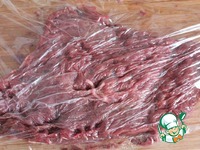 На кусочки сердца выкладываем немного моркови. Сворачиваем рулетом, перевязываем нитками или скрепляем зубочистками. |