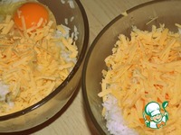 К готовому рису добавить часть (1/2) сыра тёртого на крупной тёрке и яйцо. Я для удобства перемешивания делала это в двух мисках, риса получилось много. |