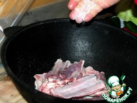 И укладываем на дно казана эти пластинки курдюка, желательно так, что выстлать дно полностью. |