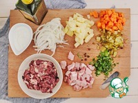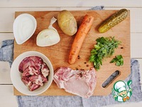Овощи очистить, нарезать кубиками, лук порезать полукольцами. Большую часть огурцов также порезать кубиками. Куриные сердечки разрезать на половинки, печень и свинину — на небольшие кусочки. |