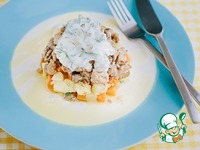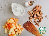 Выложить теплый салат слоями через кулинарное кольцо. Первый слой из моркови и картофеля, второй — сочное мясное ассорти, третий — из огурцов с зеленью и соусом. |