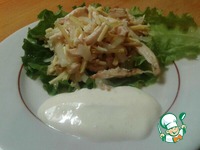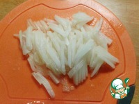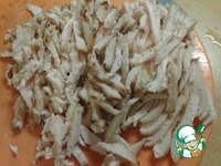 Куриную грудку также режем соломкой или (при желании) разбираем на волокна. |