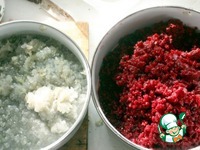 Получаем тазик с красной массой и луко-чесночную миску. |