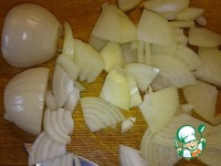 Мясо промыть и нарезать небольшими порционными кусочками. Залить водой (2 литра) и поставить вариться на 30 минут. За это время порезать лук. |