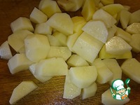 Картофель порезать небольшими кусочками и отправить к мясу в кастрюлю. Варим 10 минут. |
