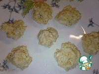 Замешиваем тесто на галушки. Соединяем муку, отваренную пшеничную крупу, воду. |
