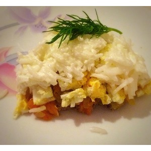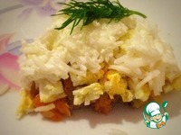 В салатник выкладываем: 1 слой - сайру 2 слой - обжаренные лук с морковью 3 слой - нарезанные яйца 4 слой - рис, который обмазываем майонезом. |