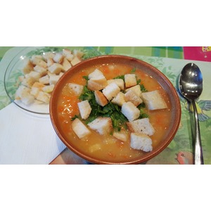 Наливаем суп. Насыпаем в тарелку петрушку и гренки.