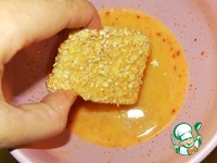 Разогреть сковородку с маслом. Окунуть каждый кусок сыра в яичную смесь, |
