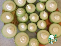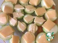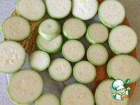 Теперь нарезаем сыр небольшими пластинками и кладём по одной на кружочки кабачка. |
