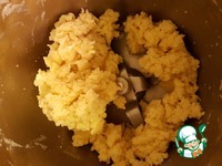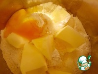 Муку, соль, сахар, пекарский порошок, желток, лимонный сок и сливочное масло кусочками смешать. |