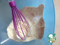 Смешиваем все сухие ингредиенты: овсяные хлопья (перемолотые в блендере - но не обязательно), мука, отруби, соль, разрыхлитель. |