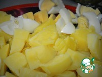 Отварной картофель режем теплым, крупными кубиками, яйца тоже крупно. |