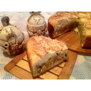 Готовый к выпечке пирог смазать молоком, посыпать кунжутом по желанию и отправить в разогретую до 180 градусов на 25-30 мин. Время может чуть измениться в зависимости от формы и вашей духовки. |