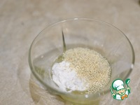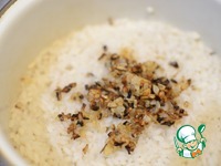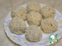 Белок, 1ст. ложку кунжута и крахмал, слегка взбить, добавить к рису, тщательно перемешать |