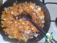 В это время чистим морковь и лук. Морковь натираем на тёрке, лук режем и отправляем на сковороду пассироваться на несколько минут. |