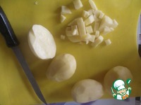 Картофель чистим, режем кубиками и добавляем в бульон. |