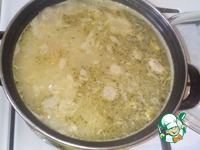 Взбалтываем яйца и выливаем тонкой струйкой в суп, постоянно мешая по кругу. Чем быстрее мешать, тем мельче получаются "кудряшки". Варим ещё 2 минуты и накрываем крышкой. |