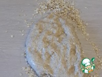После подъема теста обмять его прямо в миске, слегка смазав руки маслом. Стол обильно посыпать овсяными хлопьями. Выложить тесто и руками слегка растянуть его |