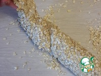 Теперь, взяв тесто за концы, начать скручивать багет, обваливая его в хлопьях |