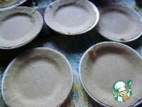 Духовку нагреваем до 180 градусов. Тесто делим на 8 кусочков. Каждый кусочек тонко раскатываем. С помощью тарелки отрезаем ненужные кусочки. И выпекаем каждый корж около 7-10 минут. |