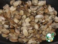 В это время в глубокой сковороде растапливаем масло, добавляем нарезанные грибы, соль и перец по вкусу и готовим переодически помешивая, 6-8 минут до готовности. И перекладываем в тарелку. |