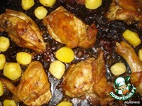 Курицу разделать на порционные куски, замариновать на 20 мин. в майонезе, сое и приправах. В это время начистить картошки, курицу выложить на противень, смазанный маслом, а картошку обвалять в оставшемся маринаде и разложить между курицей. Поставить в духовку на 40 минут. Такая вкусняшка получается!!!