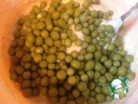 Добавить горошек, можно и замороженый отварить. Аккуратно перемешать. Жарить оладушки на средне-сильном огне с двух сторон при закрытой крышке в небольшом количестве растительного масла. |