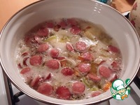 Охотничьи колбаски нарезать кружочками, добавить к овощам, обжарить ещё 2 минуты. |