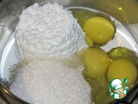 Творог, яйца и сахар смешать миксером и слегка взбить до пышности. |