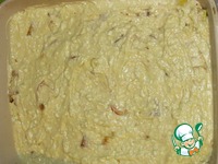 Залить тестом, слегка перемешать, чтобы не все фрукты были внизу, и разровнять ложкой. |