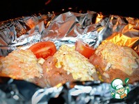 В смазанную маслом форму выкладываем филе.. рядом кладем помидор, чеснок и яблоко (оно на вкус.. я люблю!) |