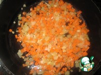 Добавляем морковь и чеснок. Перемешиваем и слегка обжариваем. |