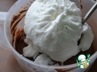 Отделим желтки от белков. Вводим по одному желтку в шоколадную массу. Миксуем. Добавим сахар и муку. Миксуем. Взбить белки. Лопаточкой медленно перемешать их с массой. Включить духовку на 180град. |