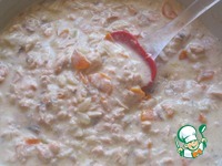 Посыпать мукой, перемешать. Вливать в сковороду молоко, в котором варилась рыба, небольшими порциями, тщательно перемешивая. Дать загустеть. |