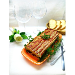 Описание: Террин (фр. Terrine) — это способ запекания, в результате которого получается что-то среднее между паштетом, запеканкой и рулетом, выложенное в глиняную или керамическую форму. Именно благодаря этой узнаваемой форме с крышкой, в которой террин готовится и подается, появилось такое название. Чаще всего эта посуда прямоугольная, обязательно огнеупорная, ярких однотонных расцветок. Террины могут готовиться из мяса, птицы, рыбы, субпродуктов, различных овощей. Есть и сладкие блюда — из творога, сыров, фруктов, шоколада.
