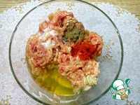 Добавляем в фарш соль, перец, белки яичные, я добавила еще паприку. Хорошенько вымешиваем и отбиваем. |