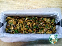 Сверху выкладываем шампиньоны с зеленью. Слегка прижимаем ложкой и сверху чуть присаливаем. |