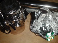 Имея в наличии различные формочки, захотелось какой-нибудь новой подачи. Для этого из фольги сделала квадраты примерно 15 на 15 см. Одела их на стакан, прижала и получились формочки. |