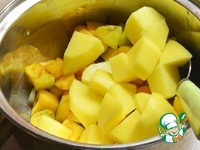 Картофель очистить, нарезать кубиками и добавить к тыкве. |