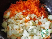 Пока варится горох лук очистить и нарезать мелко, морковь очистить и натереть на мелкой терке. Обжарить лук и морковь на растительном масле до готовности. |