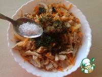 Далее смешиваем мясо, лук и морковь. Добавляем петрушку, соль, перец, уксус и глутамат натрия. Тщательно перемешиваем |