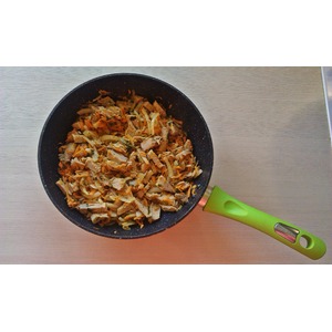 Разогреваем на сковороде оливковое масло. Выкладываем в него наше блюдо и обжариваем на слабом огне пару минут постоянно помешивая |
