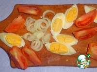Помидор и отварные яйца порезать дольками и украсить салат. |