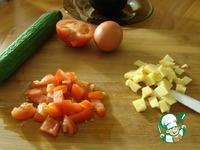 Берём всё, что нам пригодится для омлета. Сыр и половинку помидора режем мелким кубиком. Вторую половинку оставляем для подачи. |
